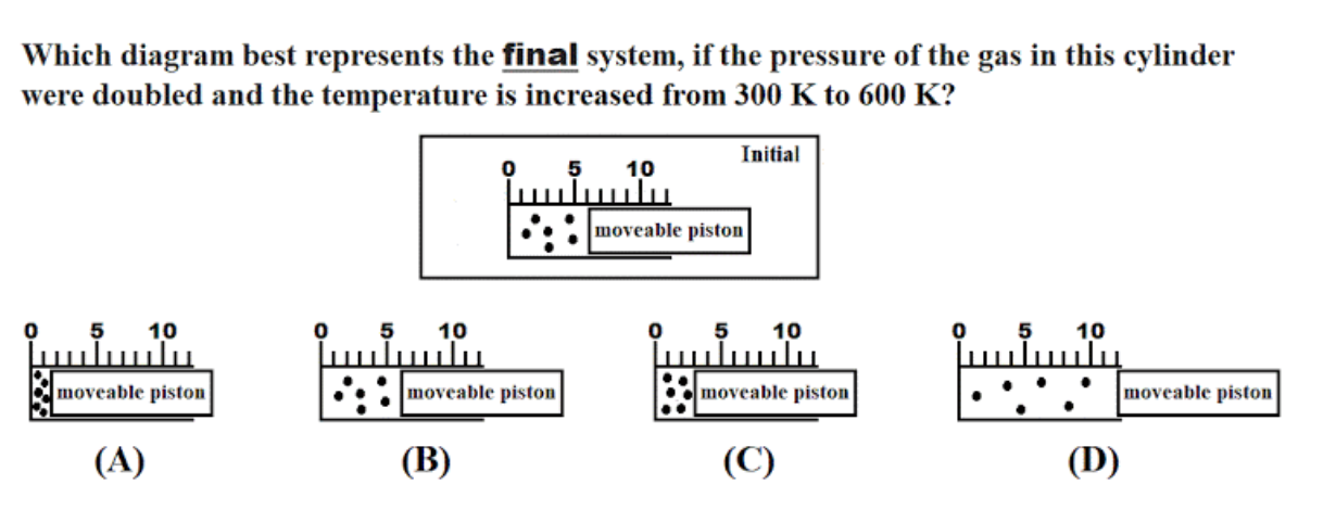 Which Diagram Best Represents The Final System If The Pressure Of The Gas In This Cylinder Were Doubled And The Temperature Increased From 200 K To 400 K