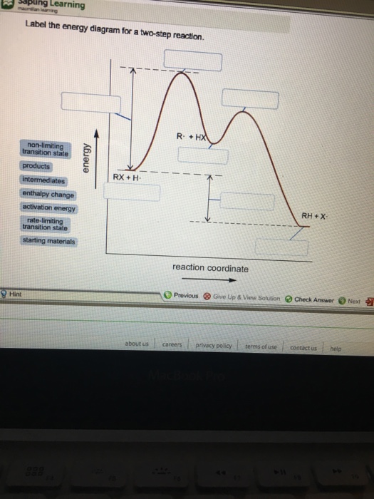 We’re being asked to label the given energy diagram.. Recall that an energy diagram is usually read from left to right.The components of a two-step energy diagram are: • Reactants: are placed on the left/beginning of the energy diagram • Products: are placed on the right/end of the energy diagram • Non-limiting transition state: is the transition state with the lowest energy in the ...