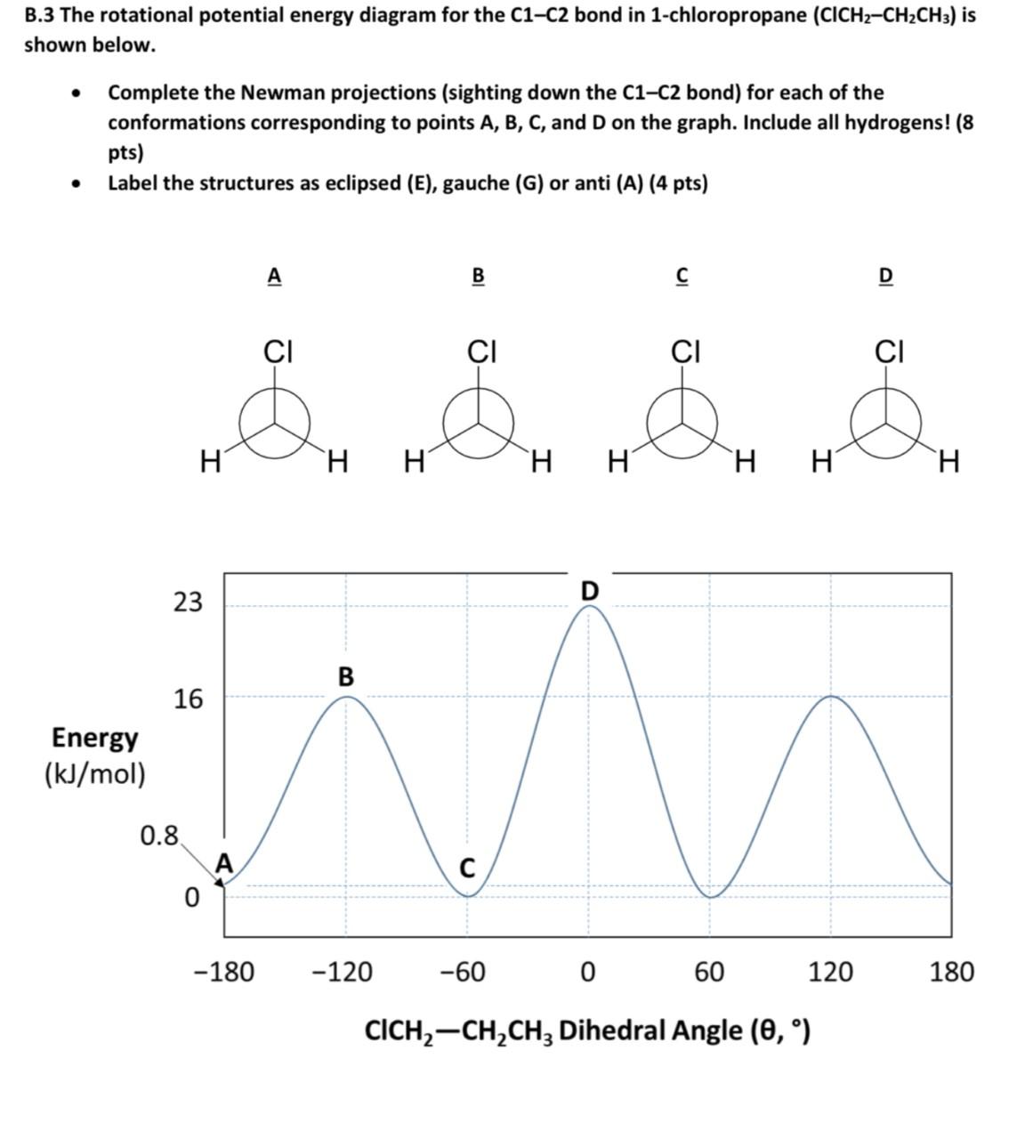 Newman projection energy diagram. 5 Jun 2019 — In order to better visualize different conformations of a molecule, it is convenient to use a drawing convention called the Newman projection. A Newman projection is a representation of the molecule looking through a C-C single bond. For every Newman projection, you need to specify the bond and the direction you are looking at. For example, for our molecule, we can look through the C1-C2 bond (even though it can be through any bond). The direction is usually shown with an eye symbol: Draw the Newman projections for pentane looking down the C2-C3 bond through a full 360 degree rotation. Start with the anti-staggered Newman projection then draw and label each Newman projection (staggered, eclipsed, gauche, anti-staggered, fully-eclipsed) for every 60 ... explain why there is a large energy difference between the two. Essentially, large groups want to be as far apart as possible, but in a Newman projection, the atoms are forced to be fairly close to one another, so there is a repulsive force present. The overlap, and the energy difference associated with this overlap, leads to two energetic subgroups of Newman projections: eclipsed and staggered.