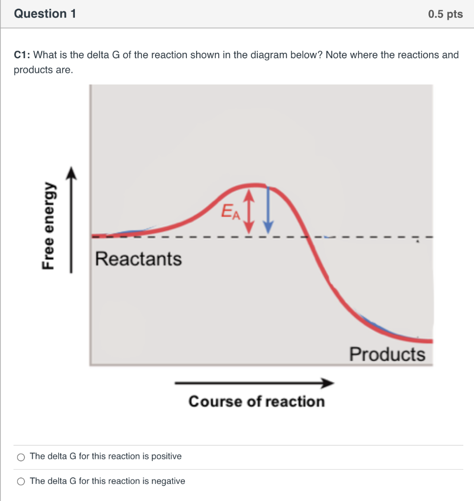 C 2 H 6 ( g) H 2 ( g) + C 2 H 4 ( g) Answer: Δ G ° = 102.0 kJ/mol; Δ G ° = 102.0 kJ/mol; the reaction is nonspontaneous ( not spontaneous) at 25 °C. The standard free energy change for a reaction may also be calculated from standard free energy of formation ΔGf° values of the reactants and products involved in the reaction. Diagram 2, because it represents a reaction with a high activation energy barrier for molecules to overcome and a very slow reaction rate, even if it is thermodynamically favorable with ΔG < 0 Diagram 2, because it represents a reaction that is thermodynamically favorable with ΔH < 0 the products formed are unstable and quickly revert to form ...