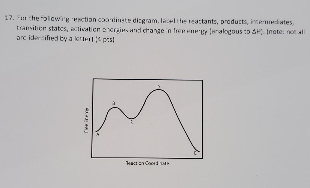 Chemistry questions and answers. Label the following reaction coordinate diagram. Energy Reactant (s) Transition State Product (s) Activation Energy (forward) Transition State Activation Energy (forward) Energy Enthalpy of Enthalpy of Reaction Product (s) Reaction AHrxn Reactant (s) Reaction Coordinate Reaction Coordinate Reset Zoom. Label them A through...on the diagram. (b) Label the transitions states on the diagram. (c) Which is the fastest step in the reaction? (d) Are the reactants or products more stable? (e) Which is the most stable intermediate? (1) Question: 6. Given the following reaction coordinate diagram, answer these questions: (a) How many intermediates are ... A Reaction Coordinate (Energy) Diagram Thermodynamic Quantities Gibbs standard free energy change (ΔGo) Enthalphy (ΔHo): the heat given off or absorbed during a reaction Entropy (ΔSo): a measure of freedom of motion ΔGo = ΔHo - TΔSo ΔG,ΔH,ΔS, ΔE are state functions If ΔSo is small, compared to ΔHo, then ΔGo o ΔE = q + w! ΔH = q p!