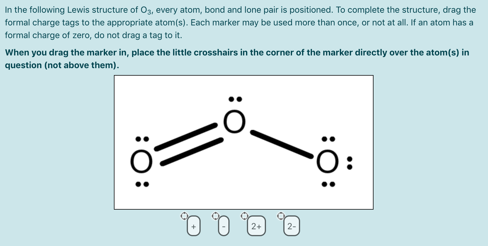Draw the Lewis dot structure of a given molecule or ion. Draw resonance structures of some molecules. Assign formal charge to an atom in a dot structure. Assess the stability of a structure by considering formal charges of atoms. Give examples for molecules and ions that do not follow the octet rule. Lewis Dot of Ozone. O 3. Back. 70 More Lewis Dot Structures. Element number 8 and a member of the Chalcogen Family or Group 16 of the periodic table. Ozone is an allotrope of oxygen, and is much less stable. Ultraviolet light cause it to decompose in our ozone layer, therefore it shielding people below it.
