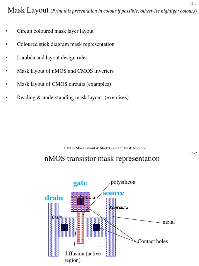 To understand the capabilities and limitations of stick diagram. To learn how to draw stick diagrams for a given MOS circuit. Outcome: At the end of this module the students will be able draw the stick diagram for simple MOS circuits. Definition Stick diagrams convey layer information through colour codes (or monochrome encoding).