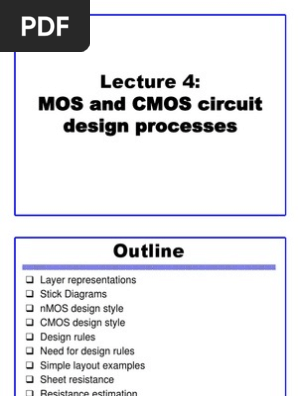 Figure 20: Stick diagram of inverter. The diagram shown here is the stick diagram for the CMOS inverter. It consists of a Pmos and a Nmos connected to get the inverted output. When the input is low, Pmos (yellow) is on and pulls the output to vdd; hence it is called pull up device. When Vin =1, Nmos (green) is • Stick Diagrams . 13.1 Motivation . In VLSI design, as processes become more and more complex, need for the designer to understand the intricacies of the fabrication process and interpret the relations between the different photo masks is really trouble some. Therefore, a set of layout rules, also called design rules, has been defined. They ... N-Well (not shown on our stick diagram) or the wafer substrate. A tap is defined using an unfilled black square. Here there will be only one conductor crossing the square (Metal1 power or ground rail ). y An N-Well Tap is inferred where the connection is from a power rail while a Substrate Tap is inferred where the connection is from a ground rail. Stick Diagram Examples - Free download as PDF File (.pdf), Text File (.txt) or read online for free.