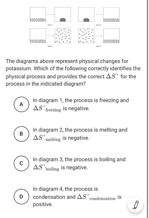 A flowchart is a type of diagram that represents a workflow or process.A flowchart can also be defined as a diagrammatic representation of an algorithm, a step-by-step approach to solving a task.. The flowchart shows the steps as boxes of various kinds, and … physical change phase change or chopping pure substance 7. ... Which particle model diagram represents only one compound composed of elements X and Z?9 pages Oct 13, 2020 — Which diagram represents a physical change,only? ... gtruicko1298 is waiting for your help. Add your answer and earn points. Answer.1 answer · 4 votes: There is no diagram The liquid will change to a vapour - it boils - when it crosses the boundary line between the two areas. If it is temperature that you are varying, you can easily read off the boiling temperature from the phase diagram. In the diagram above, it is the temperature where the red arrow crosses the boundary line.