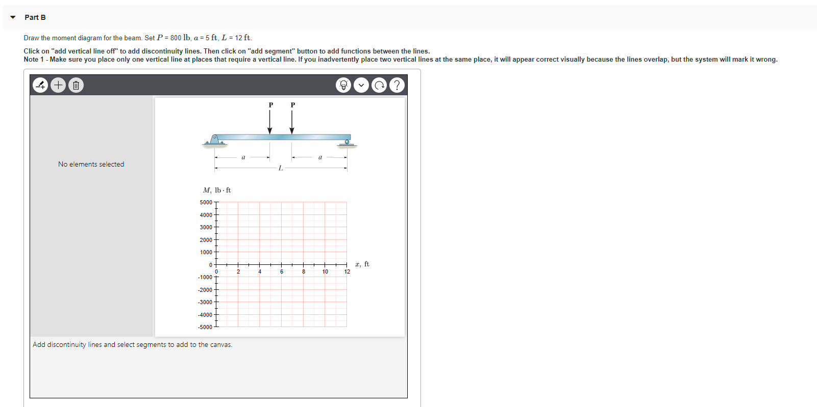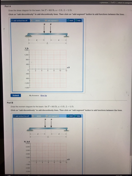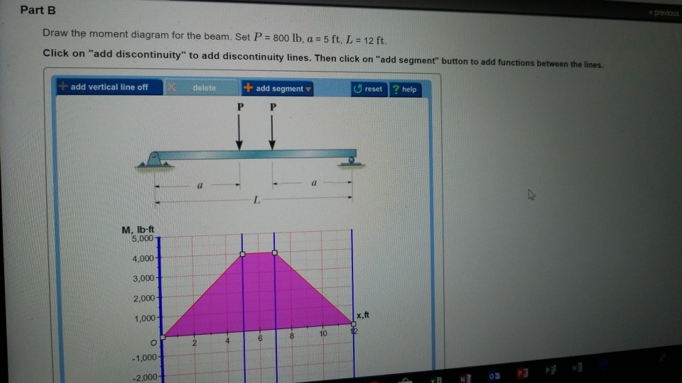 Draw the moment diagram for the beam. Set P = 800 lb, a = 5 ft, L = 12 ft. Click on add discontinuity to add discontinuity lines. Then click on add segment button to add functions between the lines. Question: Draw the moment diagram for the beam. Set P = 800 lb, a = 5 ft, L = 12 ft. Click on add discontinuity to add discontinuity lines. Steps to draw Shear force and Bending moment diagrams. In SFD and BMD diagrams Shear force or Bending moment represents the ordinates, and the Length of the beam represents the abscissa. Consider the left or the right portion of the section. Add the forces (including reactions) normal to the beam on the one of the portion. EXAMPLE 6.5 Draw the shear and moment diagrams for the beam shown in Fig. 6 -8a. Solution Support Reactions. The distributed load is divided into triangular and rectangular component loadings and these loadings are then replaced by their resultant forces.The reactions have been determined as shown on the beam's free-body diagram, Fig. 6-8b. Roof: Snow +DL = 200 lb/ft Walls: 400 lb on 2nd floor beams Railing: 100 lb on beam overhang Second Floor: DL + LL = 300 lb/ft (including overhang) Roof: Second Floor: , and evaluate the shear stress. *Also select the most economical steel section for the second-floor when 3Sreq'd ≥ 165 in and evaluate the shear stress when V = 60 k.