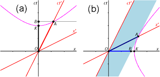 13 4. Time dilation from the Lorentz transformation Fig.10 Minkowski space-time diagram for the time dilation. The event C is located at (ct', x'=0) in the S' frame.(OC)S' = ct'. (OA)s = ct.The length OA in this figure corresponds to the length (OA)S', which is different from the length (OA)S measured in the S frame. (OA)S = k (OA)S' (the scaling factor k will be discussed the same as time goes on. When we say “as time goes on," we imply that we read the space-time diagram from bottom (t=0) to top. Imag-ine Planet A sends a spacecraft to Planet B at a speed of one half the speed of light (0.5c). The worldline of this spacecraft is represented by the blue line. It is sloped, because its po-sition changes with time.