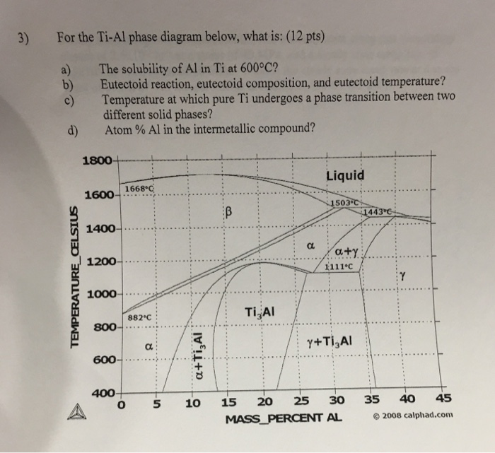 The Ti-Al phase diagram has been calculated by optimization of Gibbs energies with respect to phase diagram and thermochemical data.T0 curves, the locus of compositions and temperatures where the Gibbs energies of the liquid and one of the solid phases are equal, have been calculated over the entire composition range. In order to assure physically reasonable extrapolations of theT0curves of ... (a) In Ti-Al phase diagram, phases available at an overall composition of Ti-63%Al at temperature below 1300°C, are (solid) and . (b) The vertical line signifies the stoichiometric nature of the compound.