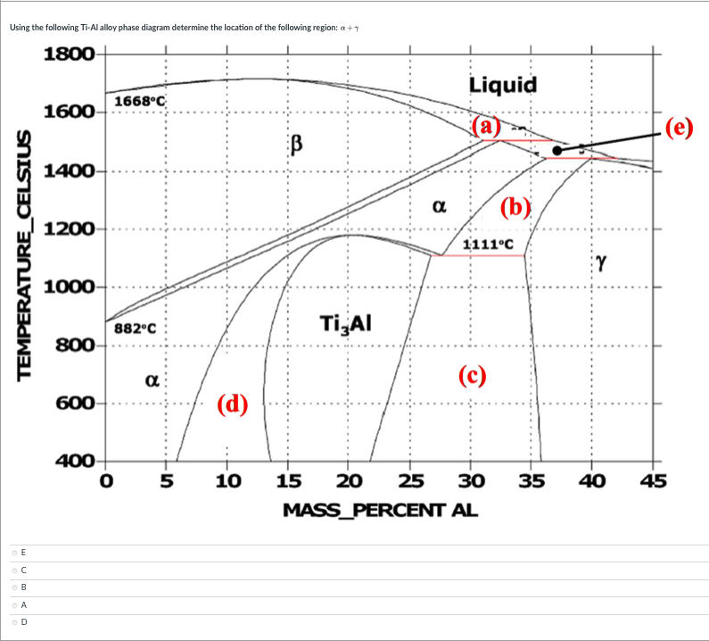 The Figure Shows The Ti Al Phase Diagram Important For The Standard Commercial Alloy Ti 6 Al 4 V 1800 1700 1670 C Liquid 1600 1500 1400 B 7 1300 11285 C 1200 1100 1000 900 882 C
