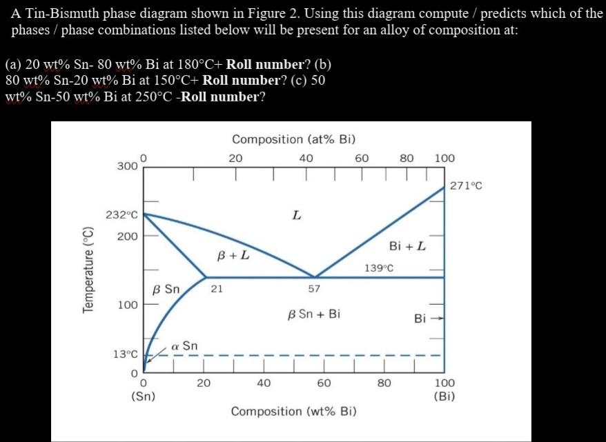 Tin bismuth phase diagram. Transcribed image text: 2. (12 pts) A Tin-Bismuth phase diagram is shown below. The following questions pertain to this phase diagram. Composition (at% Bi) 20 40 60 0 300 80 100 271°C 232°C L 200 Bi + L B+L Temperature (°C) 139°C B Sn 21 57 100 B Sn + Bi Bi 1 a Sn 13°C 0 0 (Sn) 20 40 60 80 100 (Bi) Composition (wt% Bi) 2.1 (2 pts) Is there a Eutectic point in this system? microstructure consists of dark grains of the lead-rich phase in a lamellar eutectic matrix consisting of dark lead-rich regions and light tin-rich regions. Magnification: approximately 550X [1]. THE BI-SN EQUILIBRIUM PHASE DIAGRAM Introduction Equilibrium phase diagrams are one of the single most useful tools of a materials scientist and engineer. As shown in the phase diagram Figure 1, at the eutectic composition, the tin-bismuth alloy melts at 139°C. In fact, the nanoparticles likely melt at a slightly lower temperature than this due to ... Bi-Sn System · Calculated Phase Diagram · Calculated Invariant Equilibria · Phases, Crystal Structures and Model Descriptions · Phase, Struktur- bericht. Symbol ...