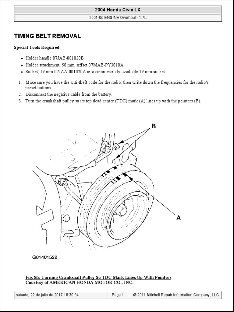 Honda Civic 1.7L timing belt diagram. In this article, via video, I will show you how to perform a complete timing belt and water pump, including the tensioner pulley and camshaft and crankshaft seals on a 2002 Honda Civic EX with the 1.7L I4 engine. This video is approximately 29 minutes long. The video was made possible with a donated timing ...