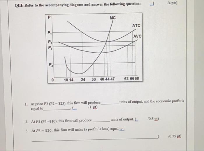 Award: 1.00 point At P 3 in the accompanying diagram, this firm will produce 14 units and realize an economic profit. produce 62 units and earn only a normal profit. produce 40 units and incur a loss. shut down in the short run.