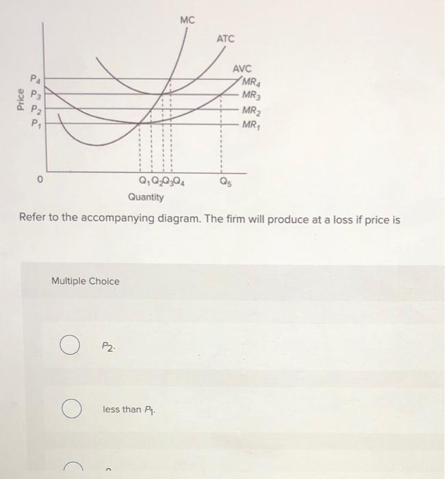 At P3 in the accompanying diagram, this firm will. produce 40 units and realize a loss, but continue to operate. Refer to the accompanying diagram.