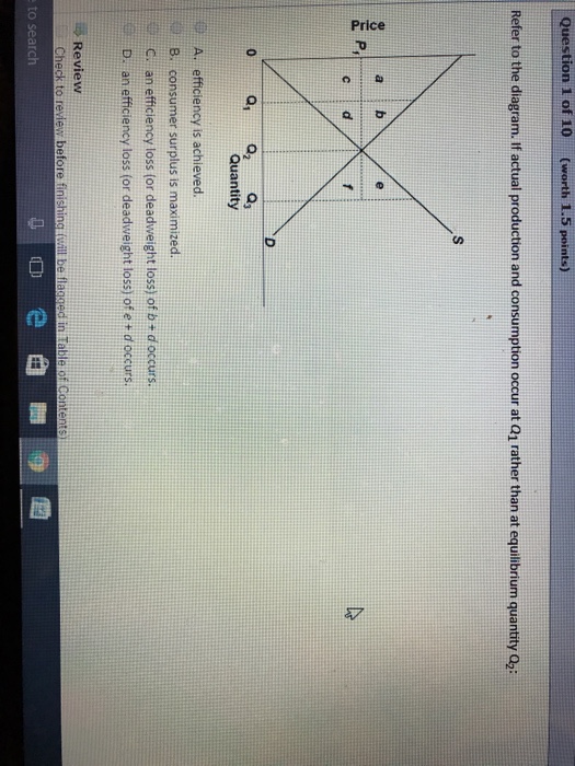Refer to the diagram. If actual production and consumption occur at Q1: A. efficiency is achieved. B. consumer surplus is maximized. C. an efficiency loss (or deadweight loss) of b + d occurs. D. an efficiency loss (or deadweight loss) of e + d occurs.