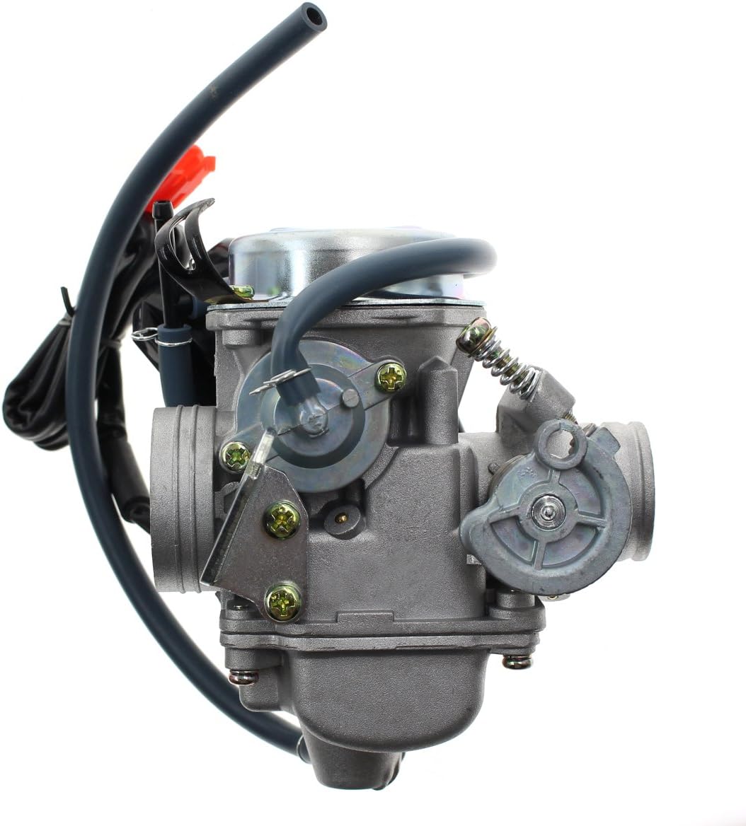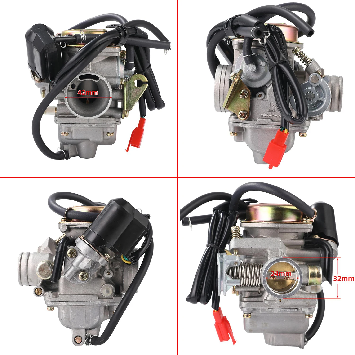 Chinese PD24J Carburetor for GY6 125cc and 150cc ATVs, Scooters-Mopeds, Dirt-Bikes and Go Karts. Version 7 This Chinese PD24J carburetor is the replacement part for many 4-stroke Chinese ATVs, Go Karts and Scooters. This carburetor fits GY6 125cc and 150cc models. Carburetor description: PD24J Electric choke with male 2-wire plug Intake side inner diameter: 24mm Intake side outer diameter ...