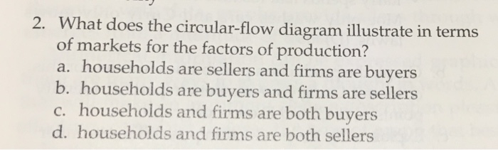 The circular-flow diagram illustrates that, in markets for the factors of production, a. households are sellers, and firms are buyers. b. households are buyers, and firms are sellers. c. households and firms are both buyers. d. households and firms are both sellers. Step-by-step solution. The circular flow diagram is a visual model of the economy that shows how dollars flow through markets among households and firms. It illustrates the interdependence of the " flow s," or activities, that occur in the economy, such as the production of goods and services (or the "output" of the economy) and the income generated from that production. The circular flow model is a representation of how activities among; consumers, government, producers, and the rest of the world are interrelated. The circular flow model highlights the flow of production, consumption, and income. Expenditure on final goods and services by either of the groups is income to the other group.