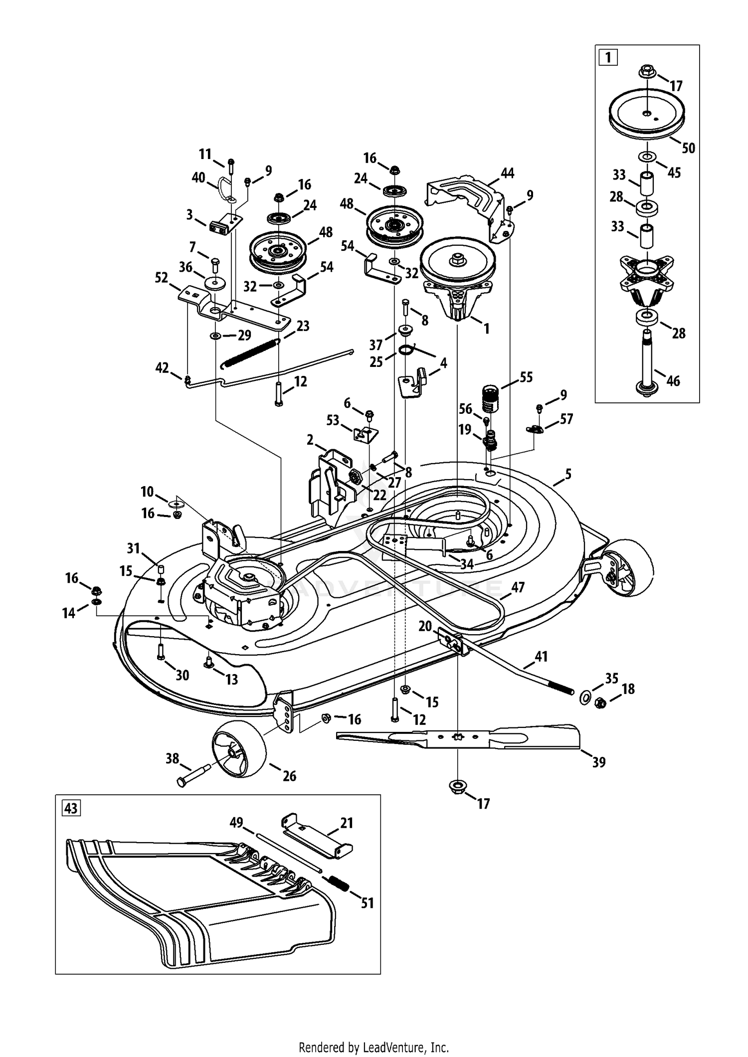 Troy Bilt 13WX78KS011 Bronco (2010) Mower Deck 42-Inch Exploded View parts lookup by model. Complete exploded views of all the major manufacturers.
