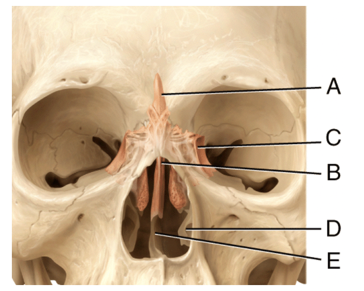 D- Crista galli E- Olfactory foramina F- Cribriform plate. In the diagram, where is the crista galli? a) C b) A c) E d) F e) G. A- Crista galli B- Perpendicular plate C- Lateral mass D- Inferior nasal concha F- Vomer. In the diagram, where is the vomer bone? a) A b) B c) F