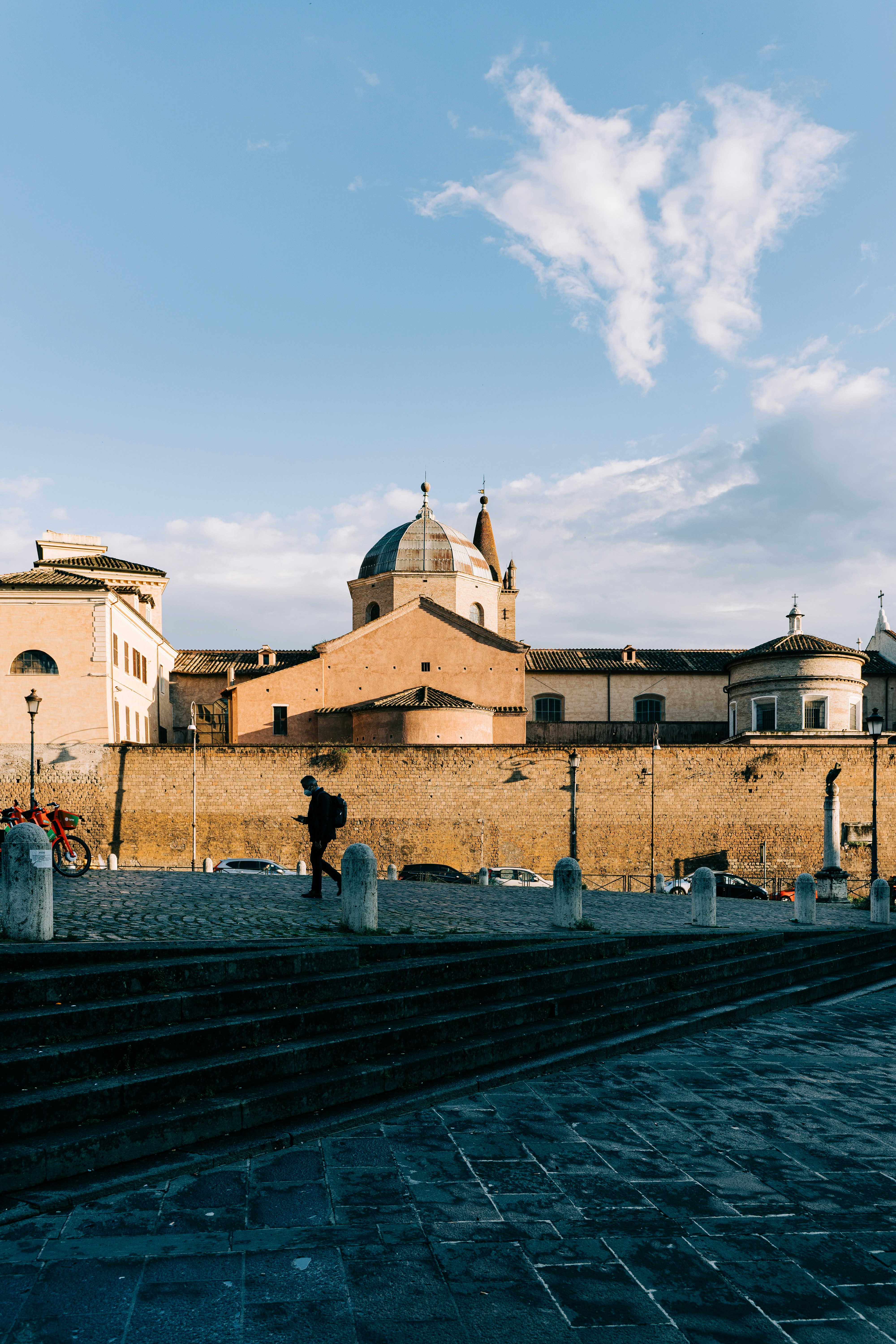 The Spanish Steps (Italian: Scalinata di Trinità dei Monti) are a set of steps in Rome, Italy, climbing a steep slope between the Piazza di Spagna at the base and Piazza Trinità dei Monti, dominated by the Trinità dei Monti church at the top. The monumental stairway of 135 steps (the slightly elevated drainage system is often mistaken for the first step) was built with French diplomat Ãtienne Gueffier's bequeathed funds of 20,000 scudi, in 1723â1725,[citation needed] linking the Trinità dei Monti church that was under the patronage of the Bourbon kings of France and the Bourbon Spanish Embass