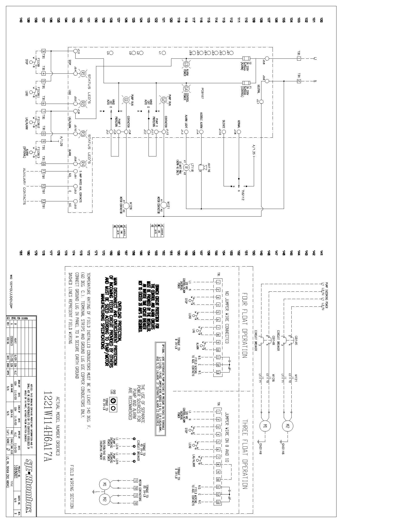 Wiring the Control Panel Operations SJE Rhombus Model 322 Three Phase Duplex control panel operates with loat switches. When all loats are in the open or OFF position, the panel is inactive. As the liquid level rises and closes the STOP loat, the panel remains inactive until the LEAD loat closes. At this point the LEAD