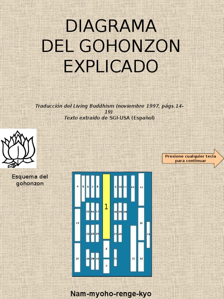 Diagram of the gohonzon. The Gohonzon is important because it is a graphic expression of the eternal Law of the universe which, if we embrace it, enables us to reveal our enlightened potential from the depths of our own lives. What follows is a brief introduction to this fascinating and enlightening object. Nichiren Daishonin first taught about Nam-myoho-renge-kyo on ... DIAGRAM OF THE GOHONZON THE LAW encompasses all elements of life. The Gohonzon is not the Law; it is a representation of the Law, illustrating the totality of life, which in Buddhism is called ichinen sanzen. Each character represents one aspect of ichinen sanzen. Represented here are first in the center is the Law of Namumyohorengekyo followed by Diagrama Gohonzon 1. DIAGRAMA DEL GOHONZON Traducción del Living Buddhism (noviembre 1997, págs.14-19) Texto extraido de SGI-USA (Español) 2. 1 Nam-myoho-renge-kyo 3. 2 Nichiren 4. 3 Zai gohan -Sello de la firma personal de Nichiren Daishonin 5. 4 Dai Bishamon-tenno -Gran Rey Celestial Vaishravana (Sánsc.) 18-gen-2016 - Questo Pin è stato scoperto da Hubert Proutt. Scopri (e salva) i tuoi Pin su Pinterest.