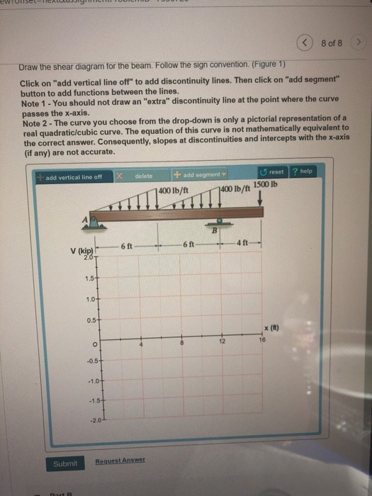 Draw the shear diagram for the beam. Follow the sign convention. (Figure 1) Click on "add vertical line off" to add discontinuity lines. Then click on "add segment" button to add functions between the lines. Note 1 - The curve you choose from the...