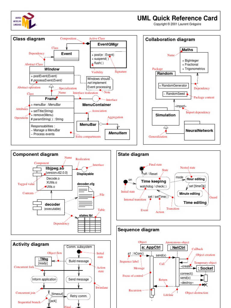 Sorry this is incomplete, we're working on it. The samples cover everything, however: Class Diagram Samples, Use Case Diagram Samples and Activity Diagram Samples. There is also a FAQ. Tobin posts tips sometimes on his blog. Element Colours You can use {bg:green}, or some other colour, to change background colour of a class or ese case. View ... The UML Class diagram is a graphical notation used to construct and visualize object oriented systems. A class diagram in the Unified Modeling Language (UML) is a type of static structure diagram that describes the structure of a system by showing the system's: classes, their attributes, operations (or methods), and the relationships among objects. Class, use case and sequence diagrams covered; UML quick reference card. Another 1-page quick reference, great to be printed and keep close to you. UML Diagrams: Detailed overview of all UML diagrams (including the new features of the latest UML versions). It’s more a reference guide than a cheat sheet though, since each diagram has its own ...