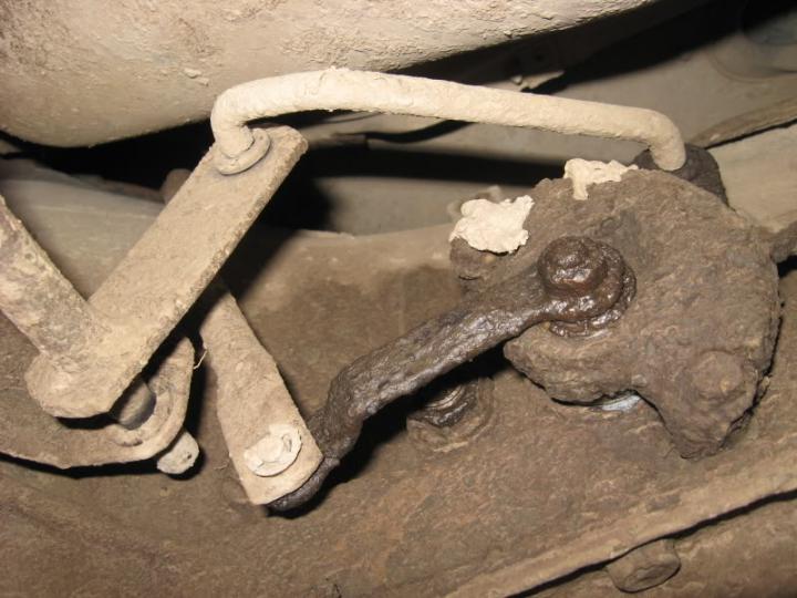 The accelerator linkage has two arms, one going up to that connects to the carb,and the kick down cable arm which faces downwards, close to the bell housing. That is the arm that this kick down cable attaches to (which is why I couldn't see it in any of my hundreds of pictures). The other end of this cable connects to the tranny.