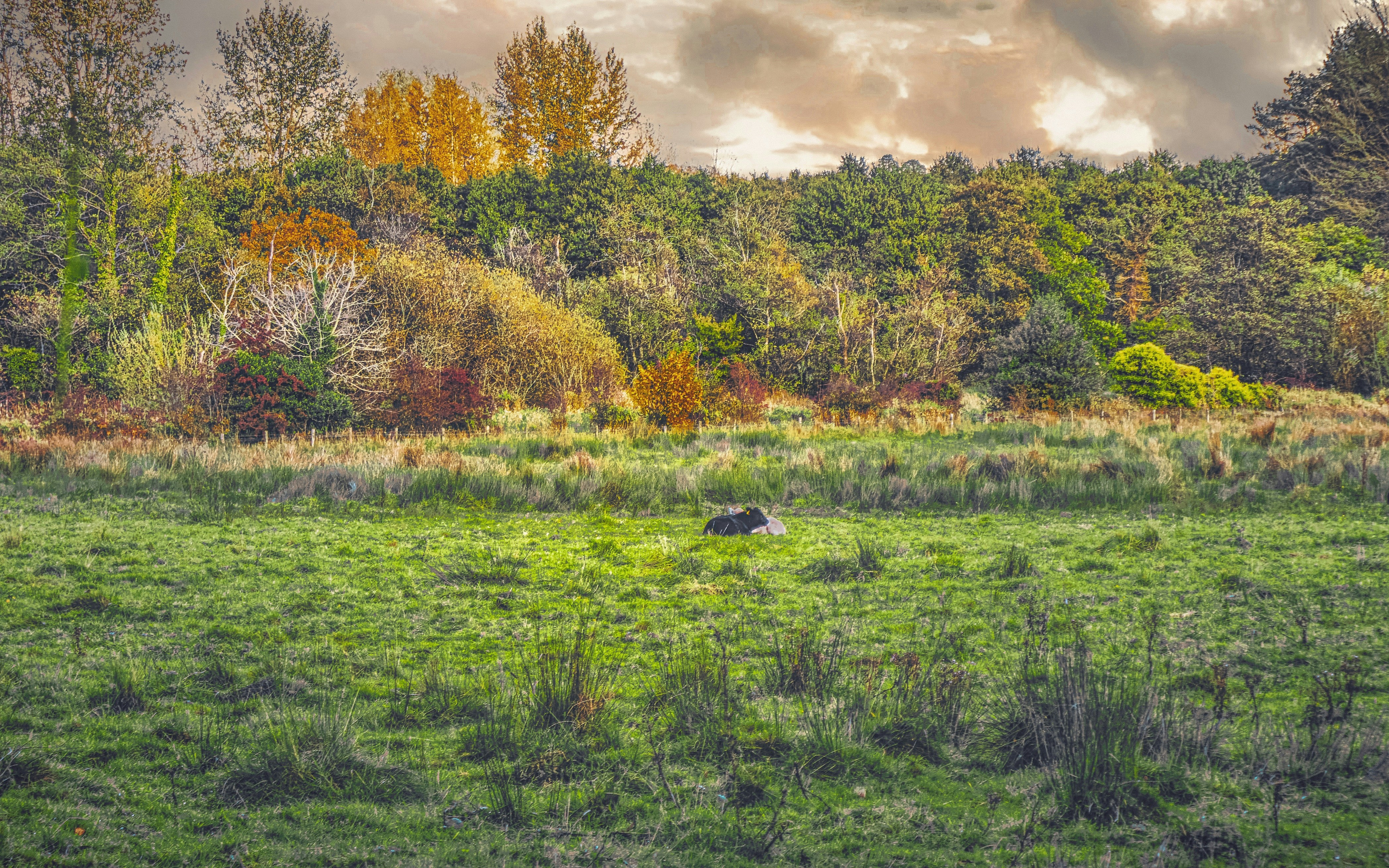 A black and a white calf lie in a pasture on a dusky, late-afternoon on an autumnal day in Lagan Meadows in South Belfast (Oct., 2019).