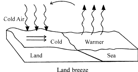 Land Breeze: Land is a bad conductor and a good radiator of heat.Therefore, it quickly gets heated during the day and cools rapidly in the night. During the night, since the land cools rapidly, a land breeze blows from the land to the oceans. Sea Breeze: On the contrary, water takes a longer time to get heated and loses heat slowly during the night.