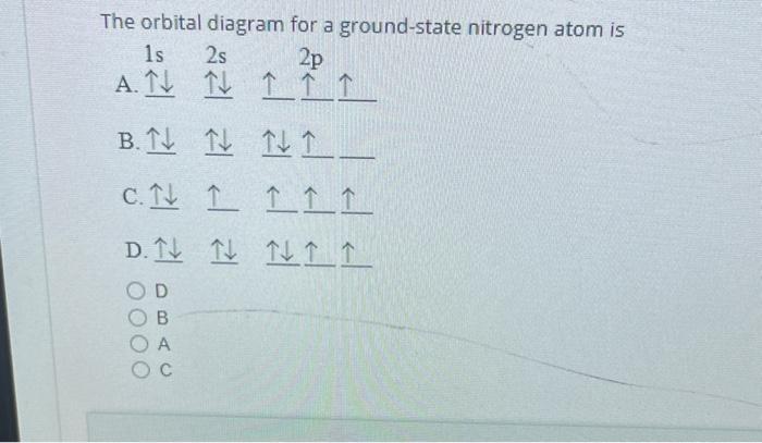 The orbital diagram for nitrogen is drawn with 3 orbitals. The orbitals are 1s, 2s, and 2p. The nitrogen orbital diagram contains 2 electrons in 1s orbital, 2 electrons in 2s orbital, and the rest three electrons in 2p orbital. Orbital diagram for a ground-state electron configuration of nitrogen atom is shown below-. In compounds of type E C l 3 , where E = B, P, A s o r B i, the angles Cl-E-Cl is in order. 4. The ground state electronic configuration of nitrogen atom can be represented by. Structure of Atom. 5. The correct order of increasing C- O bond length of. C O, C O 3 2 −, C O 2 is. 6. Feb 15, 2021 · Ground State Electron Configuration For Nitrogen. When we talk about the electronic configuration, then the ground state Nitrogen Electron Configuration is written as 1s 2 2s 2 2p 3.Below you can get the full image representation which will help you to understand the topic more easily. The orbital diagram for a ground-state nitrogen atom is A) A B) B C) C D) D ... The orbital diagram for a ground state carbon atom is A) A B) B C) C D) D. D. section 7.9 A possible set of quantum numbers for the last electron added to complete an atom of gallium (Ga) in its ground state is A) A B) B C) C D) D E) E.