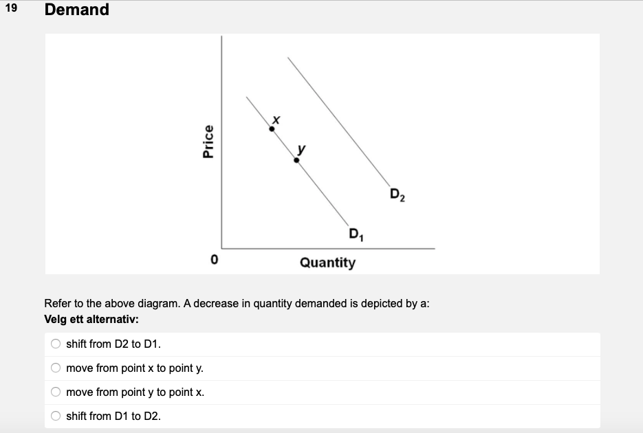 Refer to the diagram. a decrease in quantity demanded is depicted by a:. Refer to the diagram. A decrease in quantity demanded is depicted by a: A. move from point x to point y. B. shift from D1 to D2. C. shift from D2 to D1. D. move from point y to point x. D. In moving along a demand curve, which of the following is not held constant? A. The price of the product for which the demand curve is relevant. B. Price expectations. C. Consumer incomes. … A decrease in quantity demanded is represent by a upward movement from point y to point x. It shifts to the left side of the demand curve. It includes falling income and price. 56. When an economist says that the demand for a product has increased, this means that: A. consumers are now willing more of this product at eac price. Refer to the diagram. A decrease in demand is depicted by a: Shift from D2 to D1. Refer to the diagram. A decrease in quantity demanded is depicted by a: Move from point Y to Point X. Assume that the demand curve for product C is down-sloping. If the price of C falls from $2.00 to $1.75: Managerial economics and business strategy, 7th edition