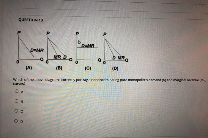 Refer to the diagram for a nondiscriminating monopolist. marginal revenue will be zero at output. Solved Refer to the above diagram for a pure monopolist ... Refer to the above diagram for a nondiscriminating monopolist. Marginal revenue will be zero at output: Answer q1. q2. q3. q4. 2.667 points Question 11 A nondiscriminating pure monopolist finds that it can sell its fiftieth unit of output for $50. We can surmise that the marginal: Answer cost of the fiftieth unit is also $50. A nondiscriminating profit-maximizing monopolist: - ScieMce Refer to the data for a nondiscriminating monopolist. At its profit-maximizing output, this firm's price will exceed its marginal cost by ____ and its average total cost by ____. asked Aug 17, 2018 in Economics by Dorothy A nondiscriminating monopolist will find that marginal ... Refer to the diagram for a nondiscriminating monopolist. Marginal revenue will be zero at output: asked Aug 17, 2018 in Economics by Colleen. principles-of-economics; Refer to the diagram for a nondiscriminating monopolist. The profit-seeking monopolist will: Microeconomics Exam 2 Chapter 12 Flashcards - Quizlet Refer to the diagram for a nondiscriminating monopolist. Marginal revenue will be zero at output: B. q 2. 5. Refer to the diagram for a nondiscriminating monopolist. ... If a nondiscriminating pure monopolist decides to sell one more unit of output, the marginal revenue associated with that unit will be: