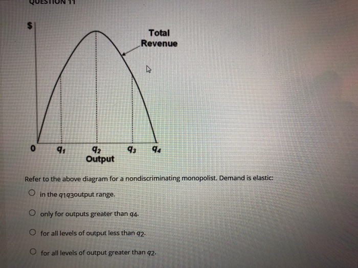 Solved Refer to the diagram for a nondiscriminating ... Economics questions and answers. Refer to the diagram for a nondiscriminating monopolist. Demand is elastic: Question 41 options: in the q1q3 output range. only for outputs greater than q4. for all levels of output less than q2. for all levels of output greater than q2.