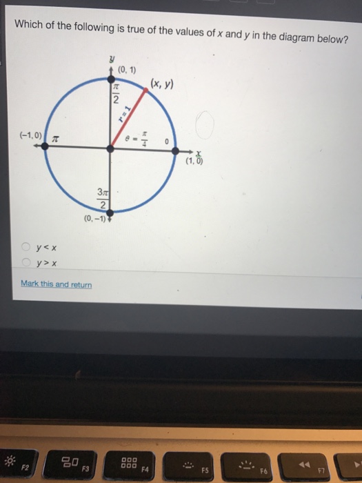 Which of the following is true of the values of x and y in the diagram below? y/x = 1. ... Which of the following is true of the location of the terminal side of an angle, theta, whose sine value is 1/2? theta has a reference angle of 30 and is in Quadrant I or II. May 21, 2020 · Which of the following is true of the values of x and y in the diagram below? A unit circle is shown. A radius with length 1 forms angle theta = StartFraction pi Over 4 EndFraction. The radius intersects point (x, y) on the unit circle. y < x y > x y + x = 1 StartFraction y Over x EndFraction = 1. 2.