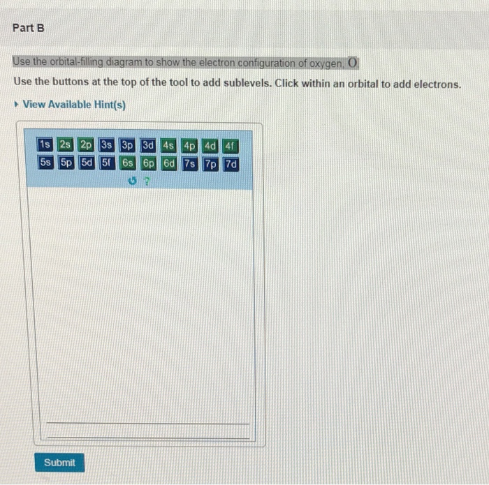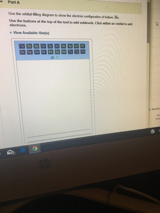Solved Part A Use the orbital-filling diagram to show the ... Chemistry questions and answers. Part A Use the orbital-filling diagram to show the electron configuration of helium, He. Use the buttons at the top of the tool to add sublevels. Click within an orbital to add electrons. View Available Hint (s) 15 23 22 35 3p 3d 4s 4p 4d 4 55 5P 5d 5f 6s 6p 6d 75 7P 7d Part B Use the orbital-filling diagram to ...