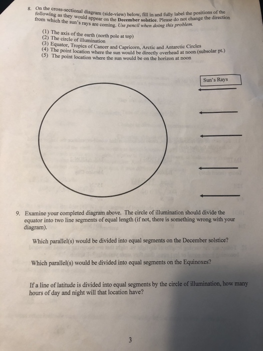 [Solved] Earth Axis Arctic Circle Tropic of Cancer Sun ... Earth Axis Arctic Circle Tropic of Cancer Sun rays Equator Tropic of Capricorn Antarctic Circle Diagram 3. Important Parallels of Latitude during the Winter Solstice 5. Diagram 3 shows the Circle of Illumination, also known as the day-night line. Label this line on the diagram. Also, label the North and South Poles. 6.