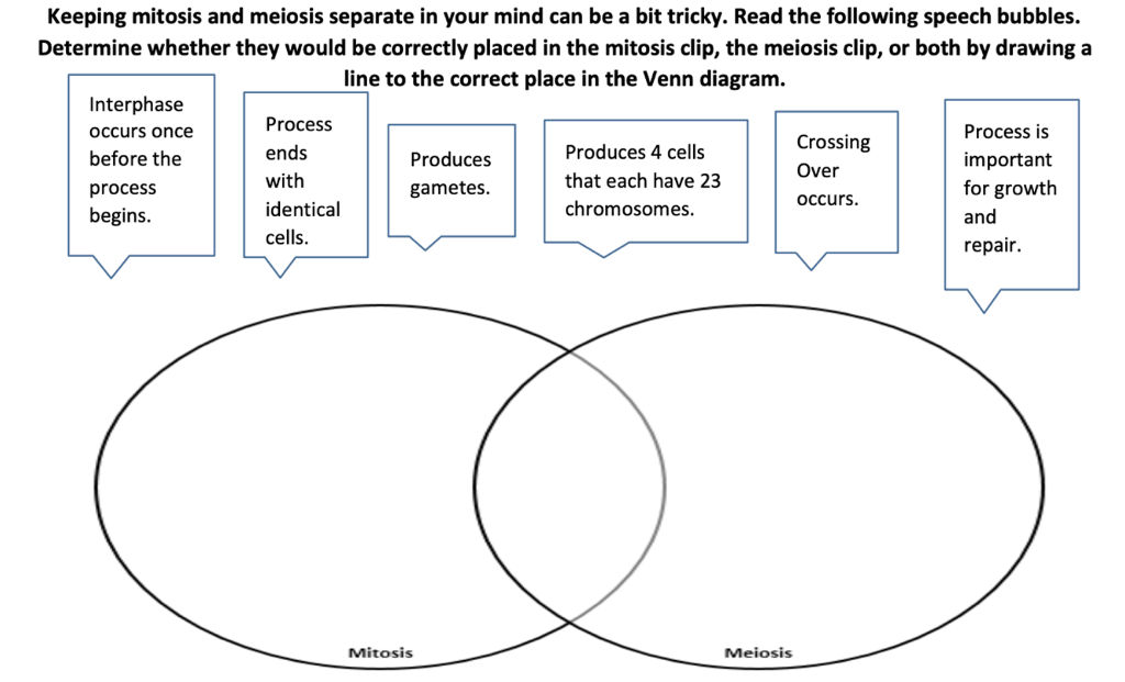 Mitosis And Meiosis Venn Diagram Worksheets & Teaching ... The mitosis and meiosis Venn diagram graphic organizer is a great way for students to compare and contrast the characteristics of these two cellular processes.Includes two versions:Version 1. Students cut and paste labels onto the correct part of the Venn diagram.Version 2.