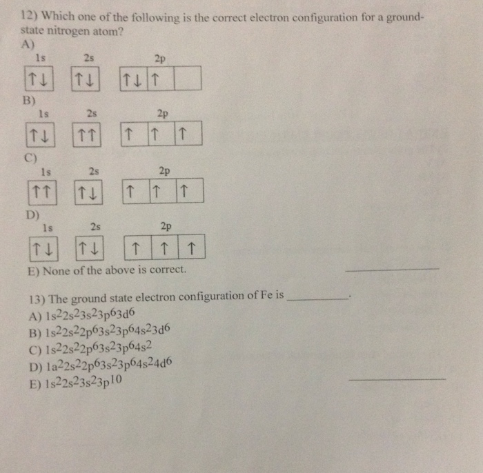 HW #3 Flashcards - Quizlet The electron configuration of a ground-state Co atom is ... 1s2,2s2,2p6,3s2,3d9 [Ar]4s2,3d7 [Ne]3s2,3d7 [Ar]4s1,3d5 ... The orbital diagram for a ground-state nitrogen atom is 1s 2s 2p A ↿⇂ ↿⇂ ↿ . ↿ . ↿ B ↿⇂ ↿ . ↿⇂ ↿ . C ↿⇂ ↿⇂ ↿ . ↿ . ↿