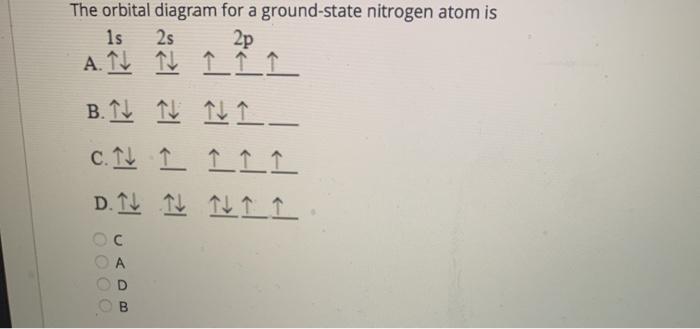 Solved The orbital diagram for a ground-state nitrogen ... The orbital diagram for a ground-state nitrogen atom is | 1s 25 A.TV C. | | 치서 cm 0 e o000 치어 리 리 리 기 기tmuo | 소 ; Question: The orbital diagram for a ground-state nitrogen atom is | 1s 25 A.TV C. | | 치서 cm 0 e o000 치어 리 리 리 기 기tmuo | 소 What is the orbital diagram for a ground-state nitrogen ... A nitrogen atom has 3 orbitals; the 1s orbital, the 2s orbital, and the 2p orbital. In this case, the 2s and 2p orbitals are the valence orbitals, as they have the electrons with the most energy. Chemistry Chapter 7 Flashcards & Practice Test - Quizlet The orbital diagram for a ground-state nitrogen atom is A) A B) B C) C D) D ... The orbital diagram for a ground state carbon atom is A) A B) B C) C D) D. D. section 7.9 A possible set of quantum numbers for the last electron added to complete an atom of gallium (Ga) in its ground state is A) A B) B C) C D) D E) E. Solved The orbital diagram for a ground-state nitrogen ... We review their content and use your feedback to keep the quality high. Option (A) is the correct orbital diagram for a ground -state nitrogen atom . Electronic configuration of nitrogen in ground state is, 1s22s22p3 or 1s22s22px12 …. View the full answer.