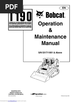 Bobcat T190 Loader Service Manual - The Repair Manual Bobcat T190 Loader Service Manual. This manual is applicable for the Bobcat T190 loader. Language English. Format: PDF. All Service Manual includes Wiring and Hydraulic Schematics. S/N 531611001 - 531659999. S/N 531711001 - 531759999. Bobcat T190 Track Loader Service Manual - 899 Pages. Operation and Maintenance Manual - 178 Pages.